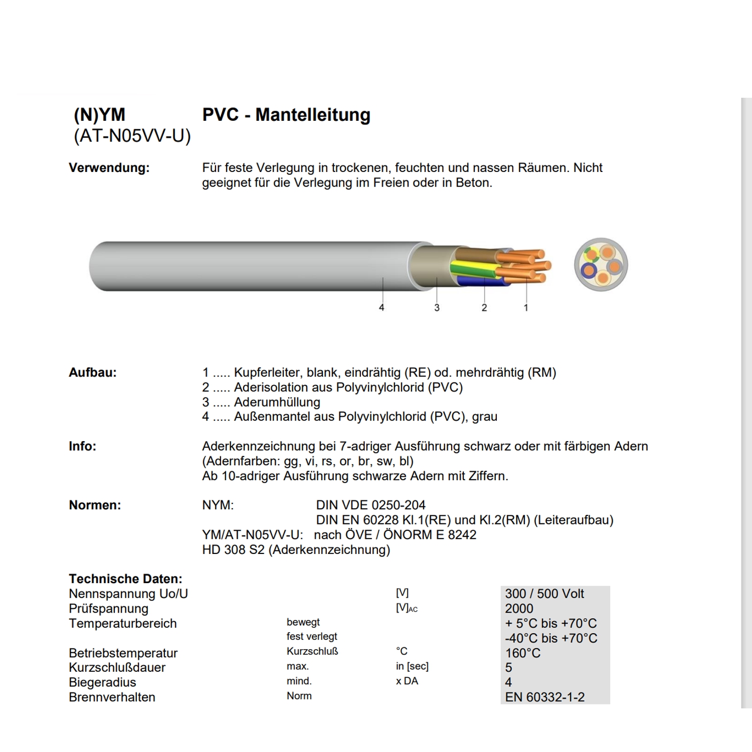 Werkstoff der AderisolationPolyvinylchlorid (PVC)