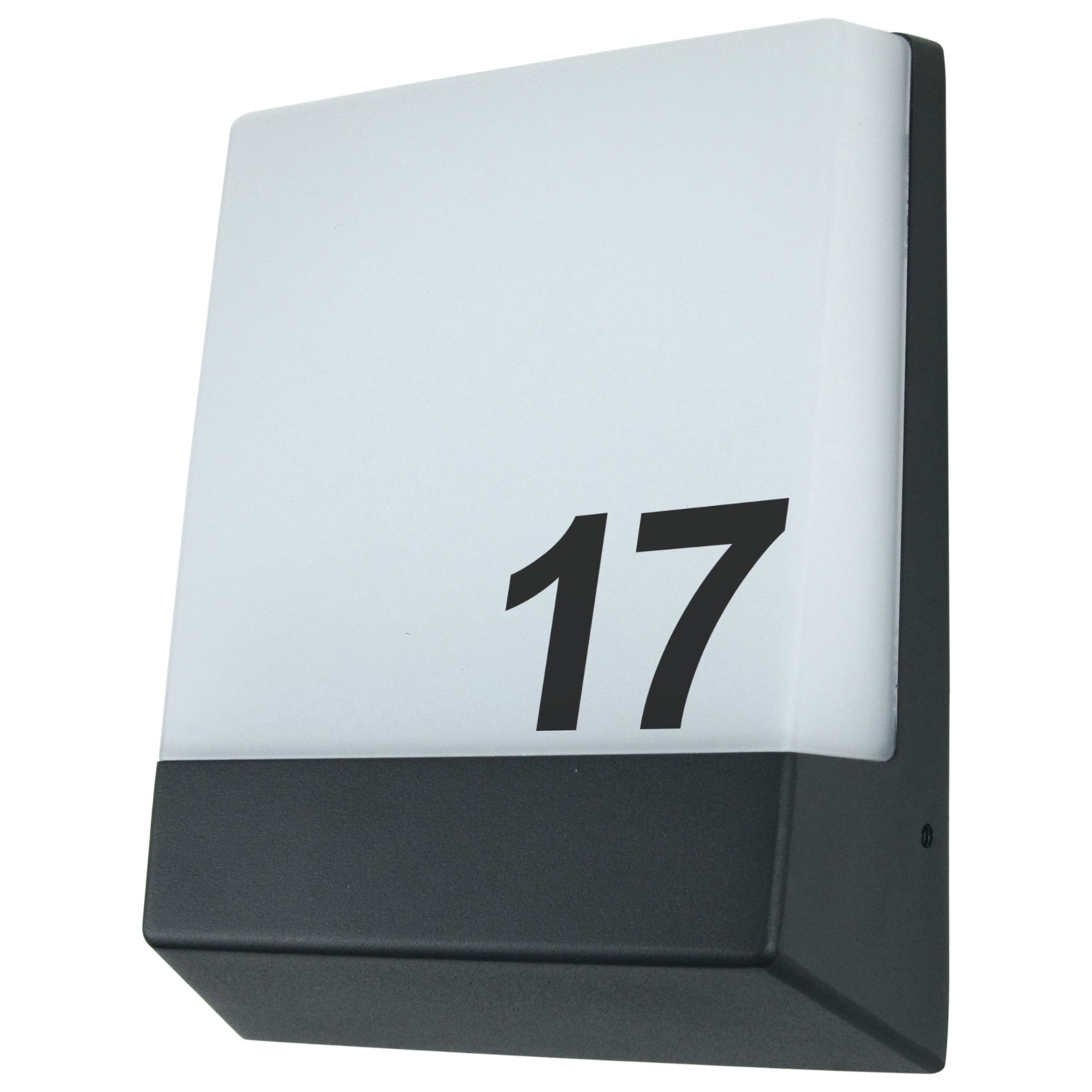 Leuchte zur Wandmontage in flacher, IP65, SK I, 3000K, 220-240V 50Hz, Aluminium-Gehäuse, Abdeckung Kunststoff opal, CRI>80, Lichtaustritt direkt, Abstrahlwinkel 120°, nicht dimmbar, Temperaturbereich - 15°C bis + 45°C , Lebensdauer bis zu 30.000h; selbstklebende Nummern inkl. -> Verwendung als Hausnummernleuchte möglich;